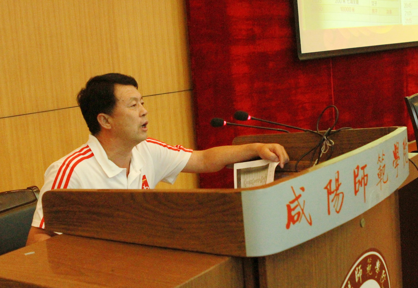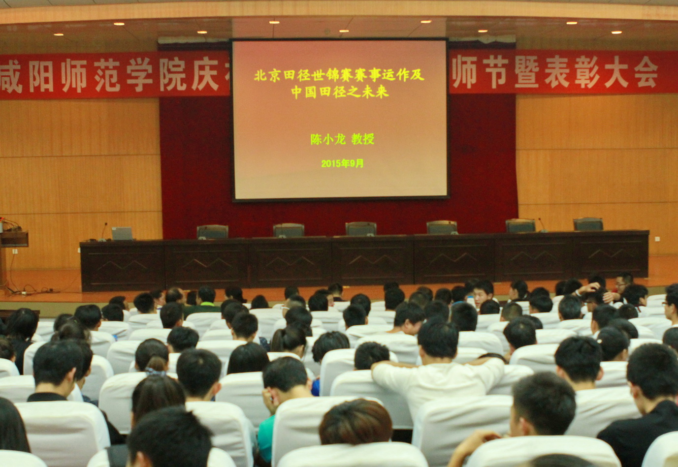 9月29日下午,体育系陈小龙教授为体育系师生做了一场题为《北京田径世锦赛赛事运作及中国田径之未来》的学术报告。报告会由体育系副主任张卫军主持,全校师生600余人聆听了报告。
