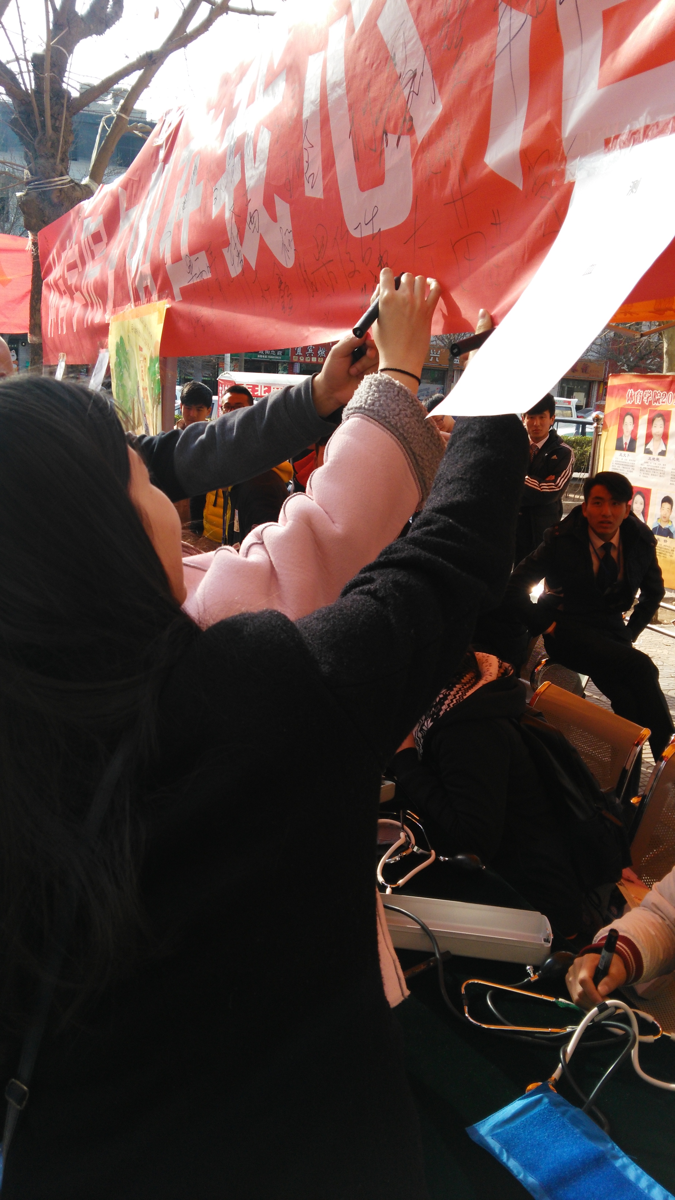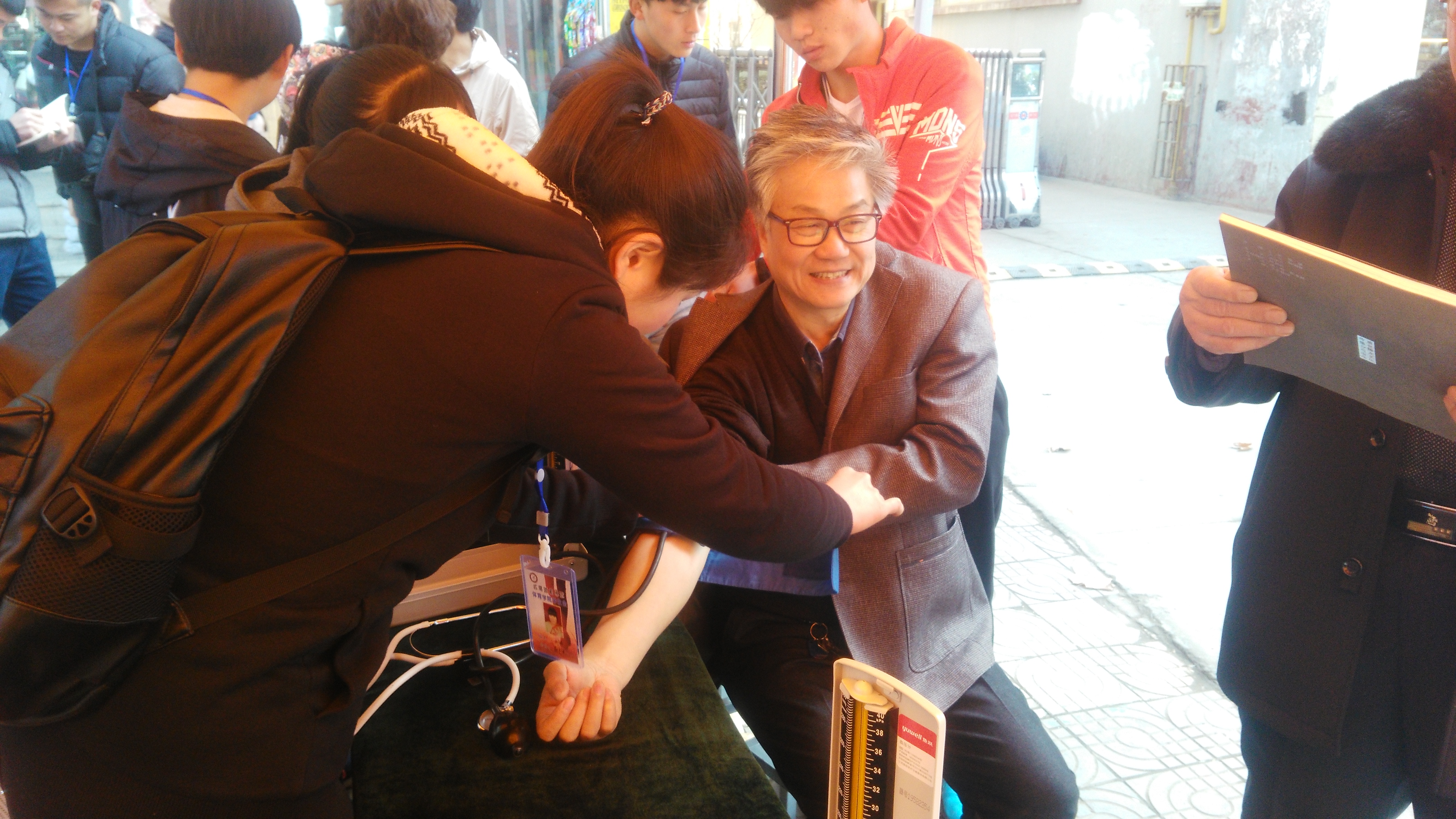 今年的“夕阳在我心中”活动以“陪伴是最长情的孝行”为主题,经过近一个礼拜的周密策划,在人口密集的师院西门设点,开展了一系列的尊老爱老活动——给老人测血压,陪老人下象棋、唱红歌,陪打太极、陪唠嗑等。