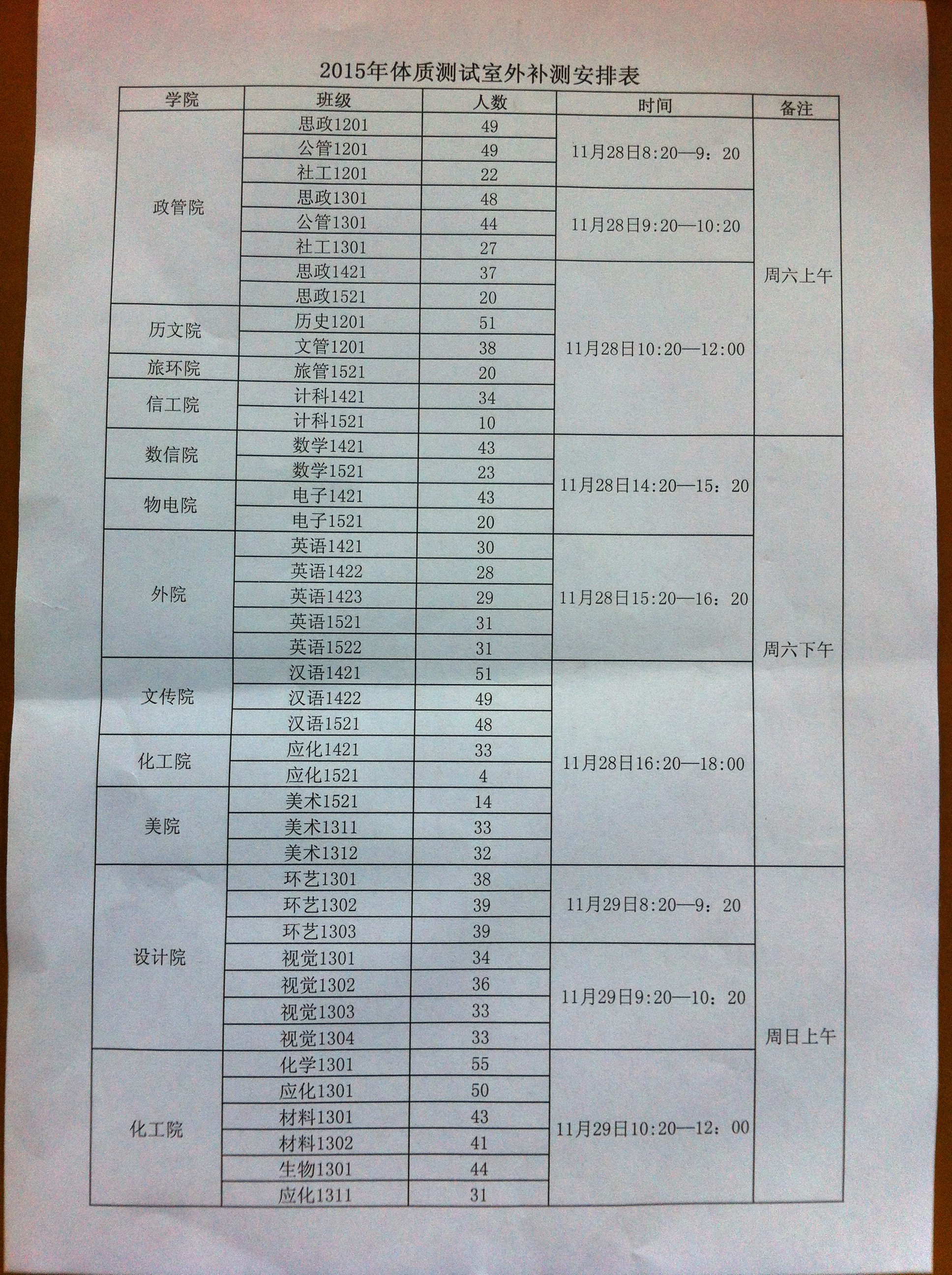 本次补测安排仅侧因天气原因未测试的员工。