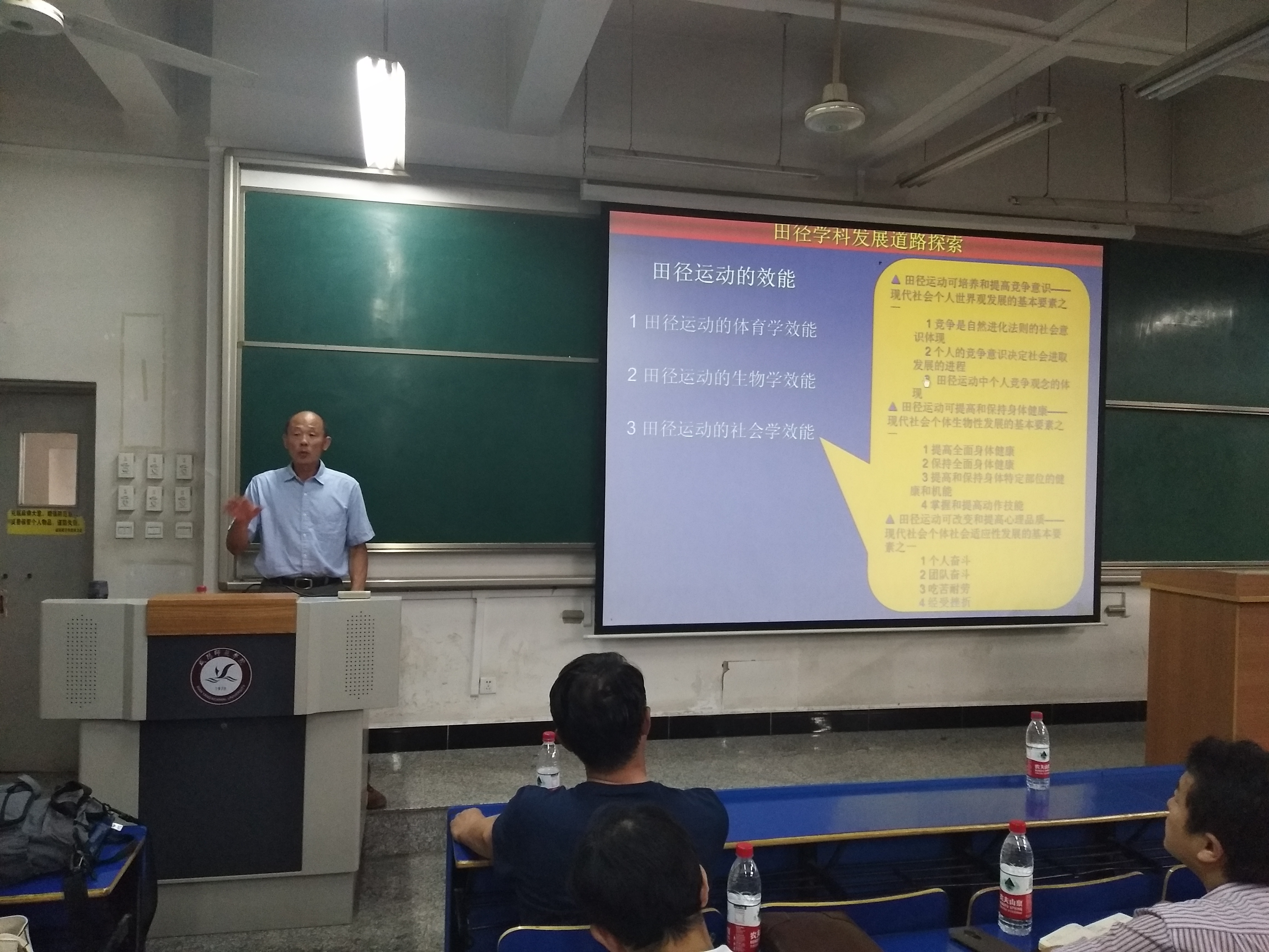 在报告中,沈信生教授从田径运动的效能、田径学科发展的可能道路以及体能与动作的关系等方面做了详细的讲解。其认为:田径运动的效能只要体现在体育学、生物学和社会学三个方面;分析了田径学科在目标指向和理论框架中的变化;重点阐释了体能与动作的关系,并最终重新定义了运动能力的概念,使在座的师生对田径学科的发展有了全新的认识。