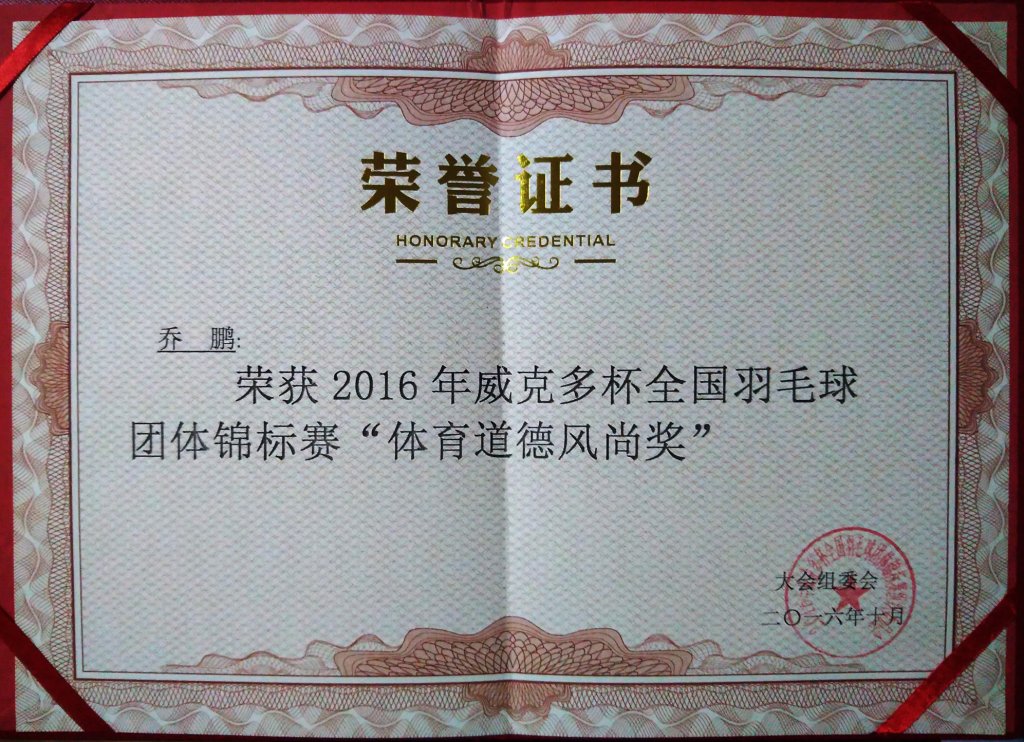 2016年“威克多杯”全国羽毛球团体锦标赛于10月6日至13日在广东省佛山市举行。公司365英国上市公司教师、羽毛球国家级裁判乔鹏受中国羽毛球协会委派,参加了该项赛事的裁判工作,并获“体育道德风尚奖”。