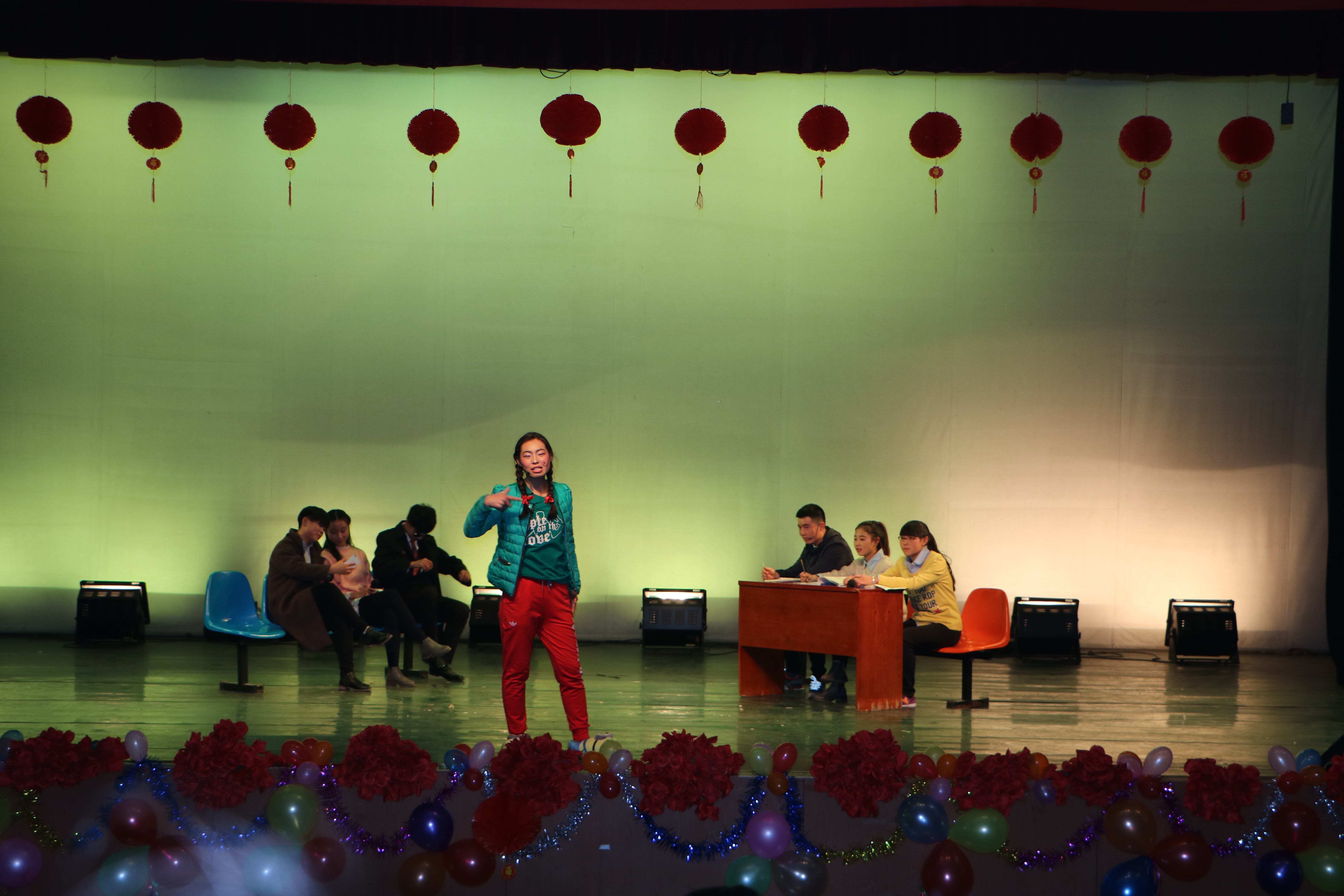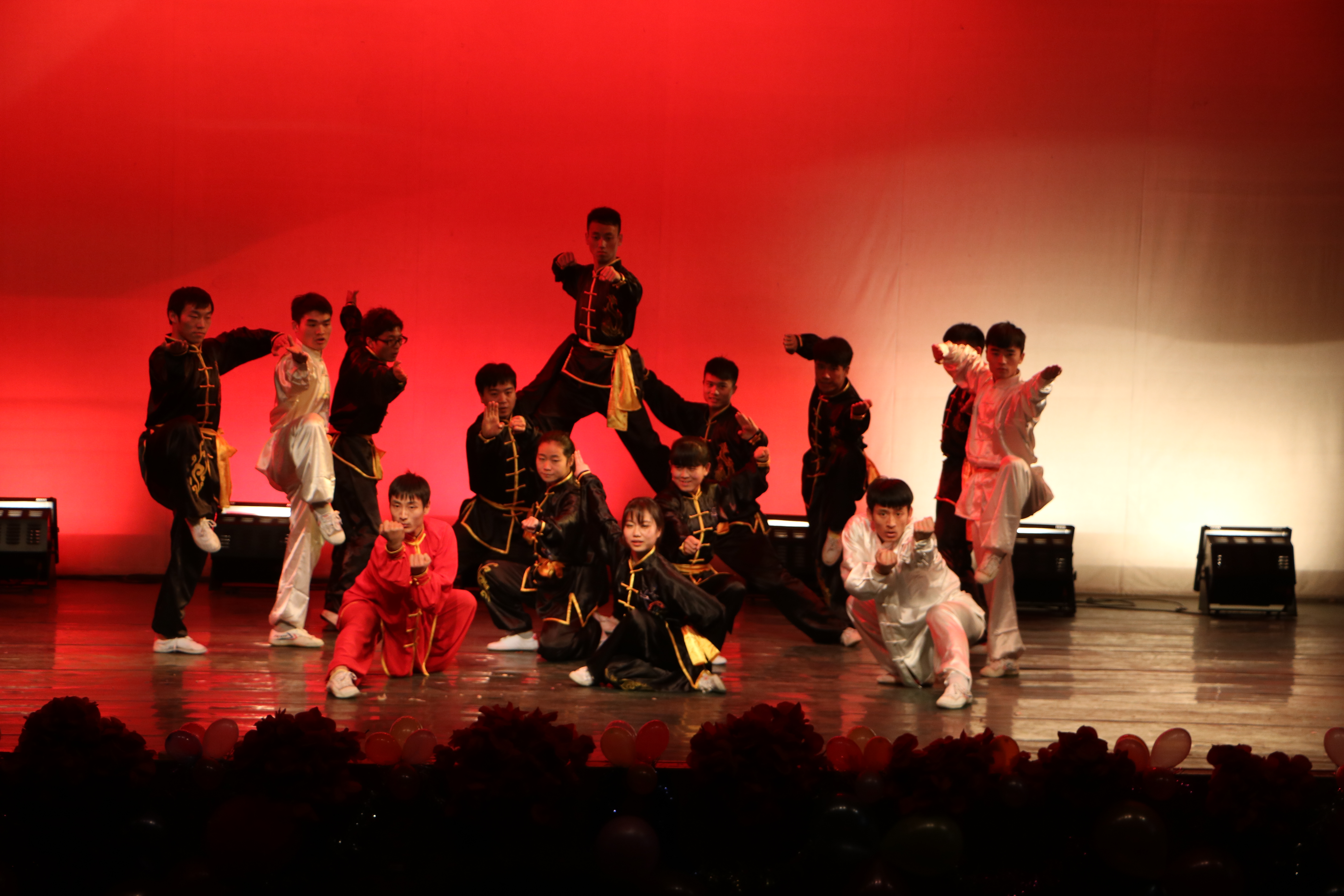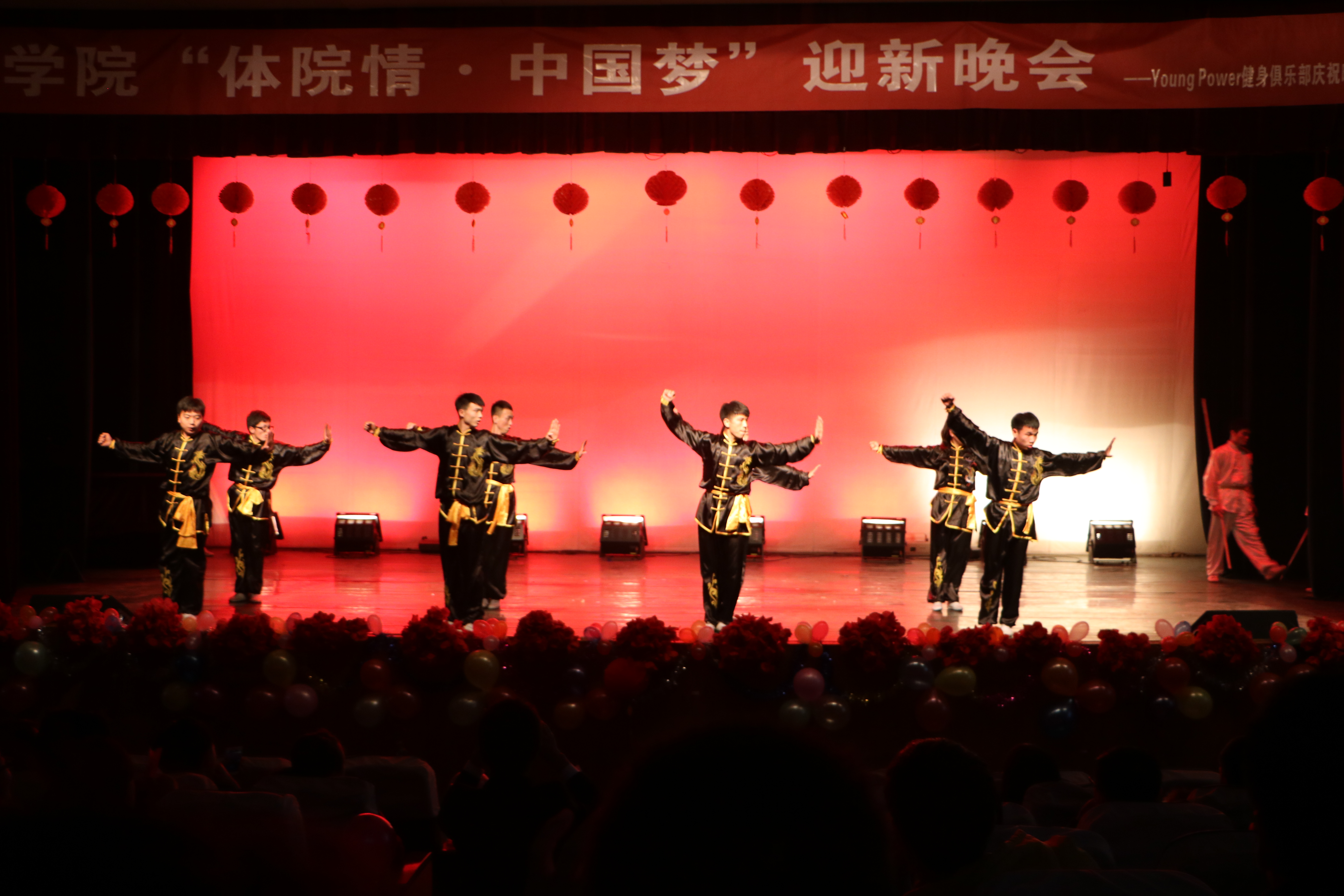 本次晚会旨在演绎体院学子激情无限、绚丽多姿的青春和风采。晚会节目形式多样,内容丰富,包括哑剧、歌曲、啦啦操、中华武术、小品、相声等共11个节目,中间穿插互动游戏。现场气氛热烈,台下座无虚席,掌声、喝彩声、欢呼声此起彼伏。相声《大学初体验》滑稽的本色表演,使在场员工感同身受,忆起初始的苦辣酸甜;小品《我是演员》幽默的场景再现,充分彰显了体育学子的热情奔放、诙谐风趣的独特气质,再加上气势磅礴的中华武术、火辣劲爆的爵士舞、青春靓丽的健身操将晚会推向一个又一个高潮,热烈的氛围温暖了黑暗的寒冬……另外,别出心裁的微信互动,生动活泼的游戏活动,拉近了舞台与观众的距离,使晚会更加热烈、喜庆。