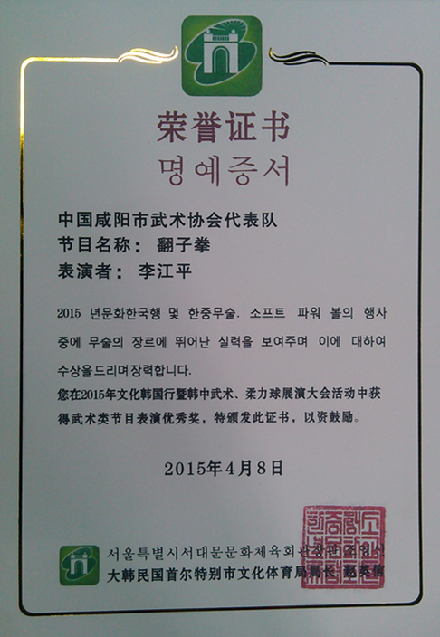 交流活动中,李江平副教授展示了传统武术八极拳和翻子拳,最终以翻子拳获得武术类节目表演优秀奖,接受了韩国首尔文化体育局局长赵英信亲自颁发的荣誉证书。这也是陕西代表队获得的两个奖项中的唯一的个人表演优秀奖,