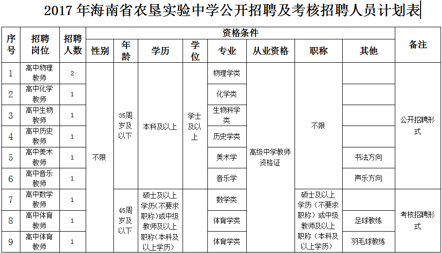 附件:2017年海南省农垦实验中学公开招聘及考核招聘人员计划表